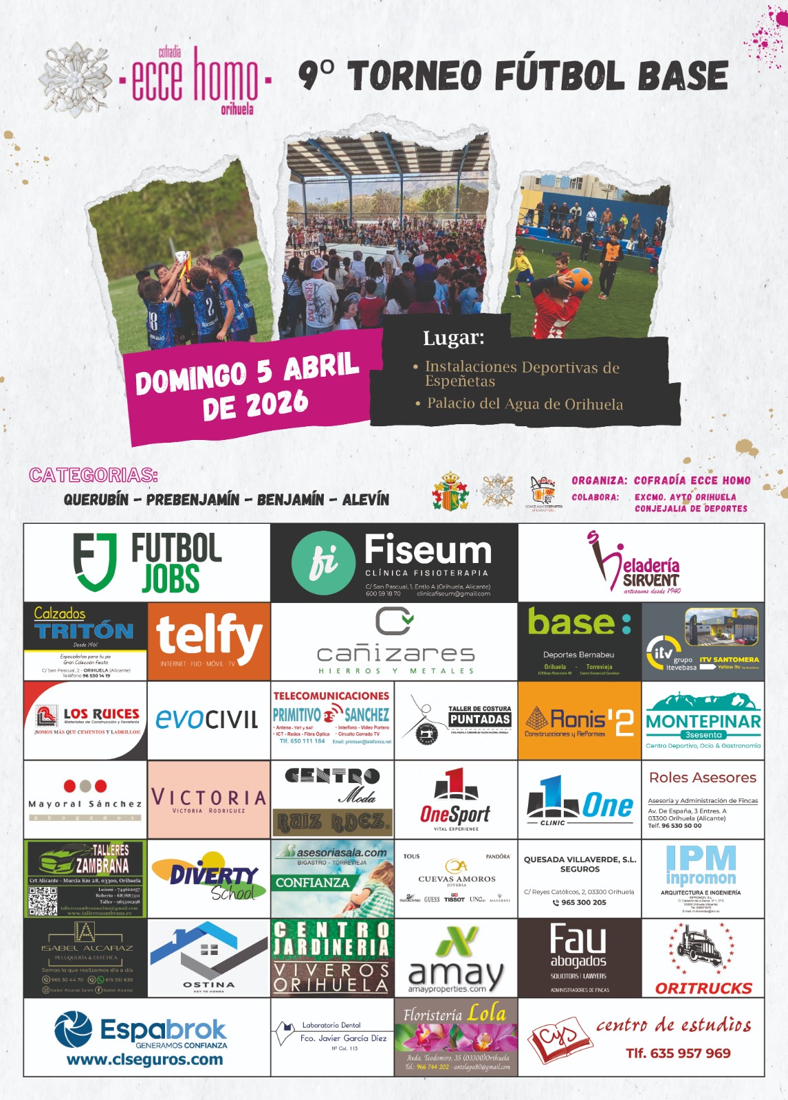 El próximo domingo 5 de abril se celebrará en Orihuela la 9ª edición del Torneo de Fútbol Base “Ecce Homo”, una cita ya consolidada dentro del calendario deportivo local. La jornada tendrá lugar en las instalaciones deportivas de Las Espeñetas y en el Palacio del Agua, donde durante todo el día se reunirán cientos de jóvenes futbolistas de distintos puntos de la Vega Baja.