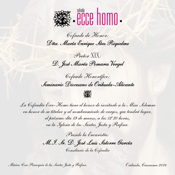 SÁBADO 16 DE MARZO: A las 18:00 h, traslado de la Cruz Penitencial, desde el Museo de Semana Santa hasta la Iglesia Parroquial de las Santas Justa y Rufina, donde permanecerá hasta el día 19 presidiendo nuestra Misa anual.