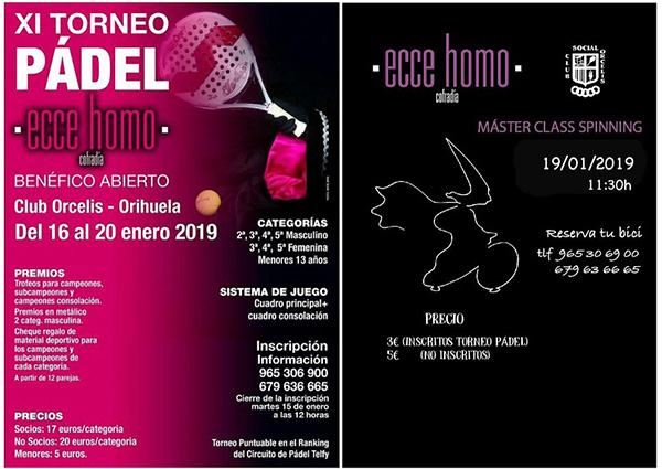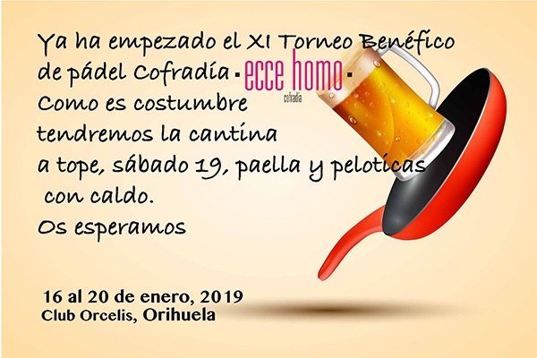 Arrancamos con el XI Torneo Benéfico de pádel Cofradía Ecce Homo. La cantina, a pie de pista, permanecerá abierta durante todo el campeonato…y el sábado tendremos paella y peloticas con caldo para todo el público en general y para que los inscritos en la Masterclass de Spinning repongan fuerzas.